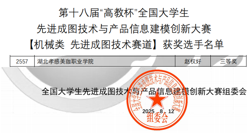 在刚刚落幕的第十八届“高教杯”全国大学生先进成图技术与产品信息建模创新大赛总决赛中,湖北孝感美珈职业学院智能制造学院学子代表学校首次出征国赛的赵权好、霍冰心、喻国毅、董铭四位同学,与来自全国1001所高校、超过15500名顶尖选手同台竞技,经过激烈角逐,赵权好同学凭借过硬技术实力与沉稳发挥,成功斩获全国三等奖!这枚沉甸甸的国赛奖牌,不仅是我校在该项顶级赛事中的历史首枚国家级奖项,更是在强手如林的“图学界奥林匹克”赛场上写下的辉煌一笔!